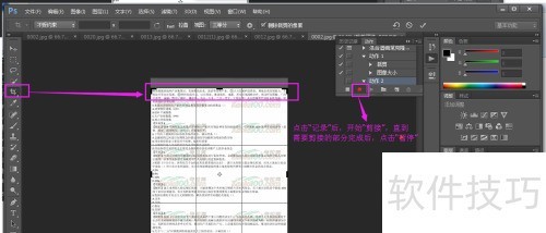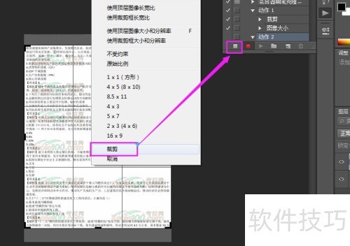 2、 第二步:启动Adobe Photoshop CS6,进入动作面板,点击新建动作并开始记录,随后在左侧工具栏选择裁剪工具进行操作,完成后点击暂停,即完成动作的创建。
