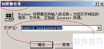 3、 弹出新建任务窗口,在文本框中输入control userpasswords2命令并执行。