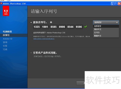 5、 打开文档,查看Adobe序列号及安装指引。将序列号复制并粘贴至步骤四弹出的安装界面中,选择简体中文语言,随后点击下一步继续操作。