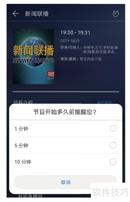 17、 打开智能遥控,进入电视节目页面,选定频道与节目。在详情页设定提醒时间,完成后手机将在预定时间通知您准时观看。