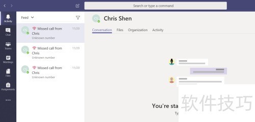 9、 点击左侧活动标签,可查看最近提及你的消息及你错过的视频或语音会议邀请。