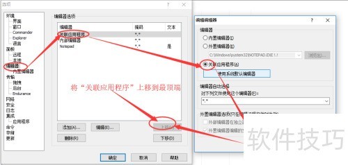 3、 在选项设置窗口中,首先选择左侧的编辑器设置,然后在编辑器选项中勾选关联应用程序,取消使用内置编辑器和外置编辑器;接着将关联应用程序选项拖动至列表最上方;最后点击确定完成设置。