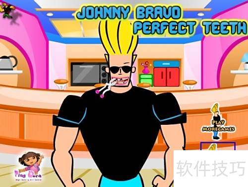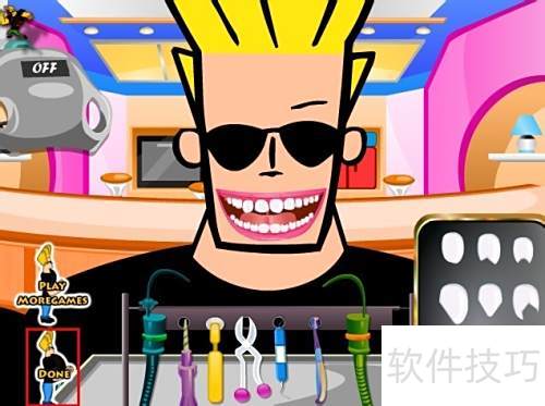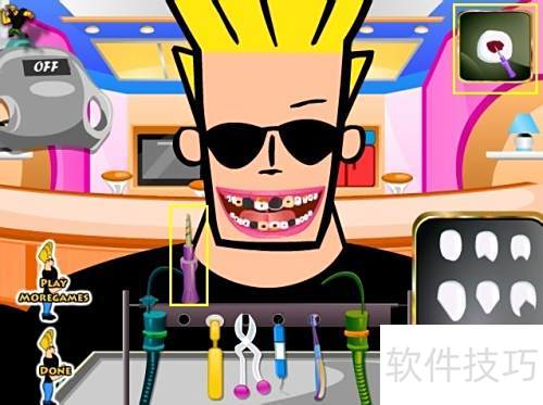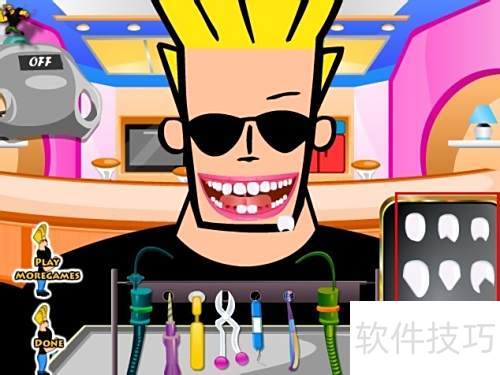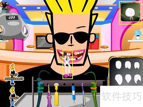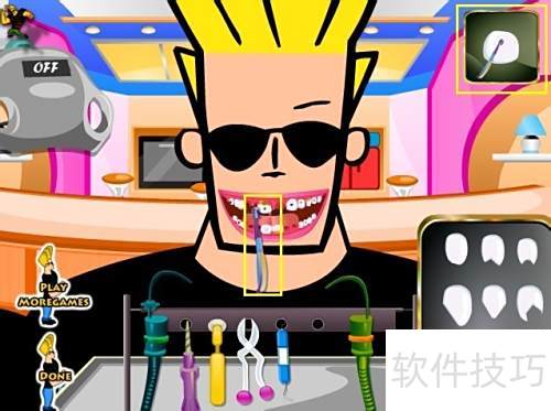 3、 在底部工具栏中选择护理工具为约翰尼治疗牙齿,每次使用时右上角都会弹出操作提示框,通过查看提示框即可了解各工具的具体功能和使用方法。