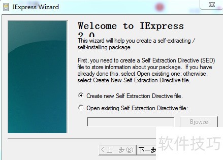 2、 选择创建新的自解压指令文件,随后点击下一步按钮继续操作。