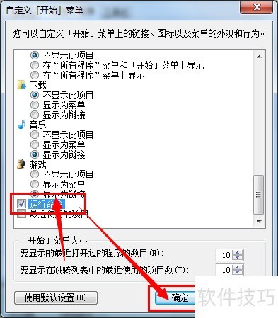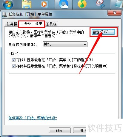 2、 将鼠标移至开始图标,右键单击并选择属性。在弹出的窗口中切换到开始菜单选项,点击自定义。在新界面中找到运行命令项,勾选前方复选框。完成设置后务必点击确定,即可在开始菜单中显示运行功能。