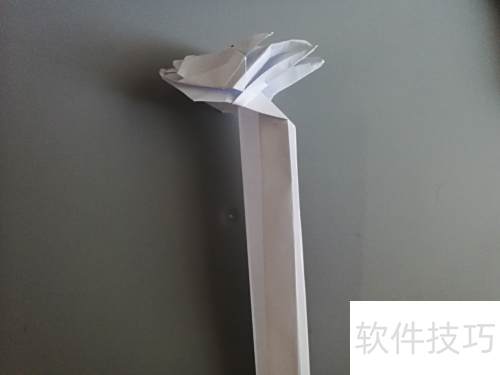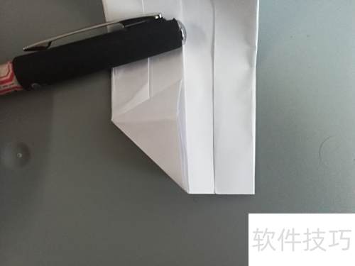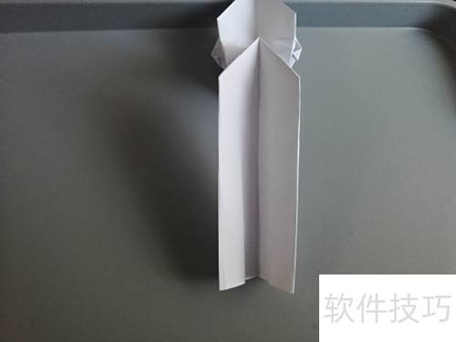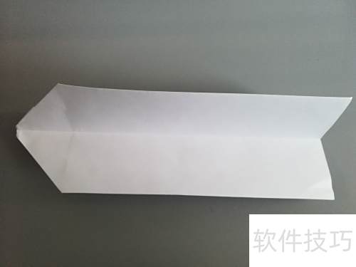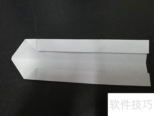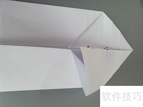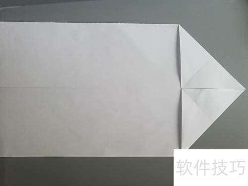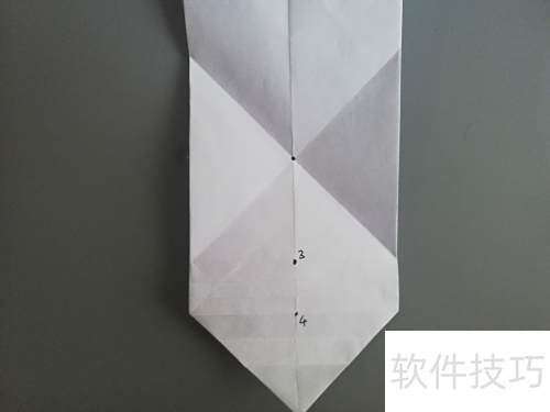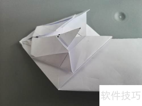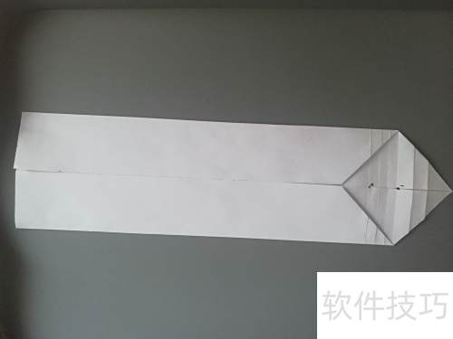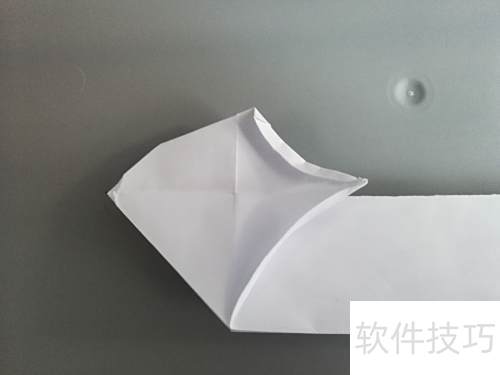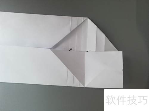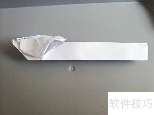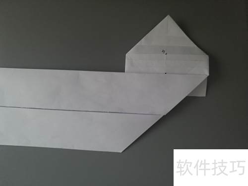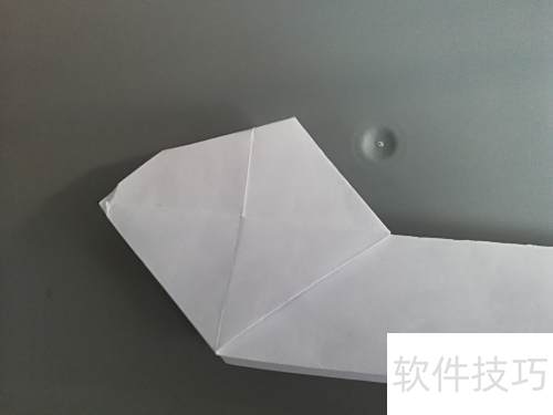 14、 处理龙尾时,先将纸条末端一侧完全展开,即打开先前折入的三分之一部分,把该侧的角沿中线向内折叠。随后将展开的三分之一重新折回原位,在折回过程中压出从连接点到顶角的折痕,并向下压实,再将其拨向反方向。另一侧按同样步骤操作即可。