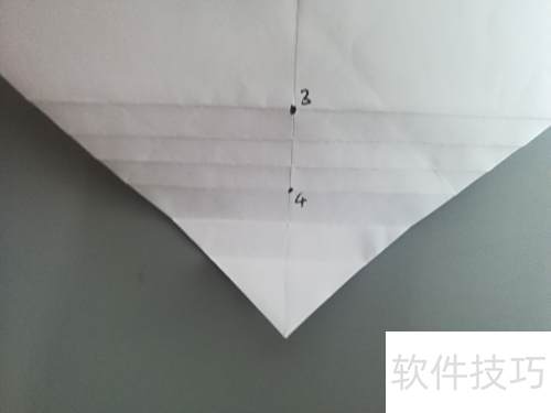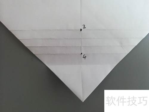 4、 翻转后,先将顶端对准上方第三条折痕折叠并压出痕迹后展开,再对准第四条折痕同样折叠展开,此时三角形区域内已形成六条平行折痕。