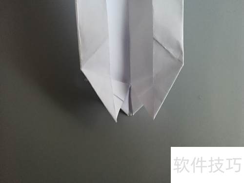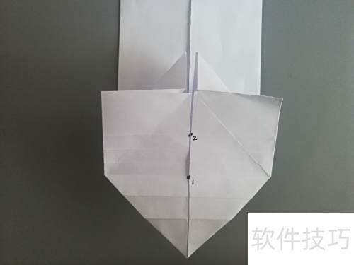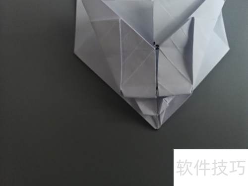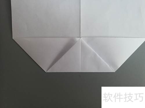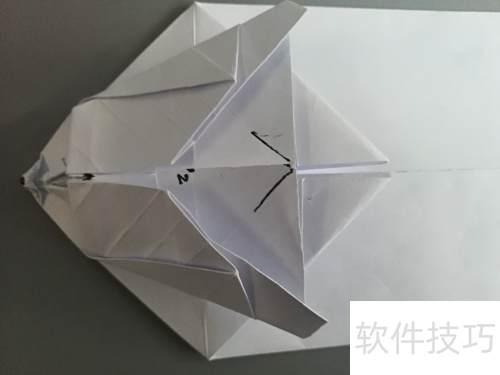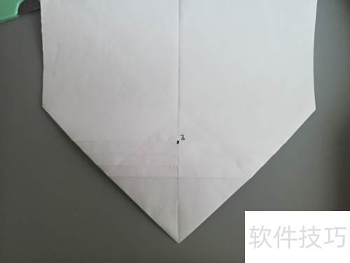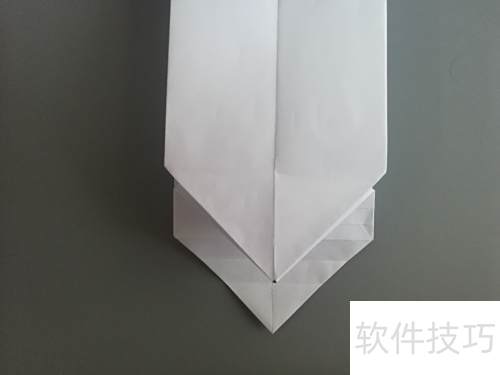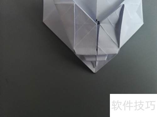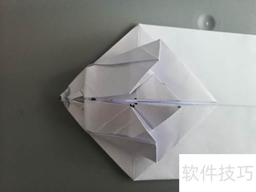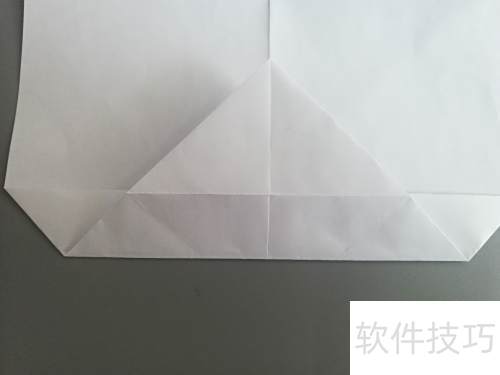 8、 将纸张翻面,按图示调整折痕。把三角形两侧纸边对齐中线向内折叠,确保整边完全折入。接着将三角部分向上折叠,折线沿两侧已有的折痕位置进行。随后将其向下折回,折痕位于前两道折痕的中间位置,并将产生的凸起部分向下压平。