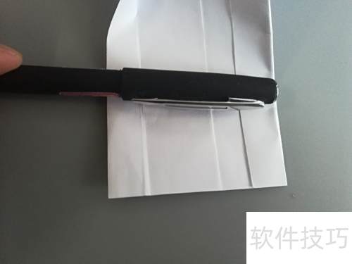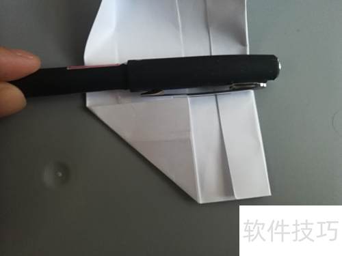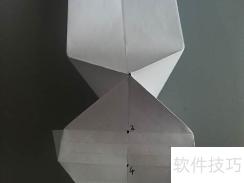 6、 将纸条翻面,以底部折痕为基准,将末端先后向上、向下各折90度,形成两条交叉折痕;接着沿交叉点对折两端,压出横向折痕,最后将纸张展开。