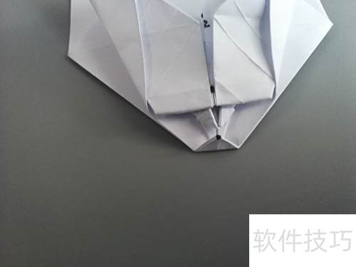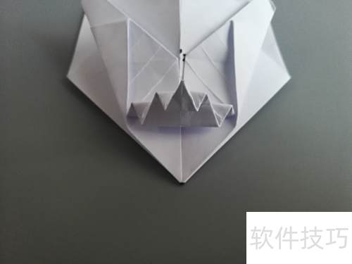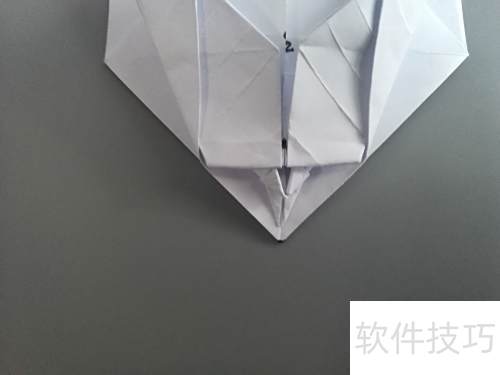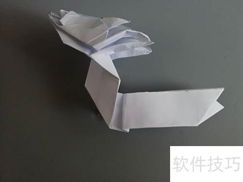 13、 将纸从底部撑开,两侧各向内折叠三分之一,恢复原状。在龙头与龙身连接处,将龙身向下垂直折叠90度,再通过波浪折法使其回到水平位置,龙头部分即完成。