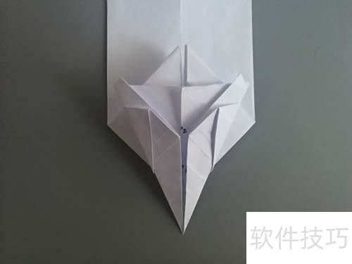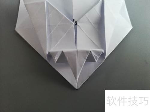 9、 将三角形再次向内折叠后回折,压平形成第二个凸起,再将凸起两边的纸沿各自向中心线对折。