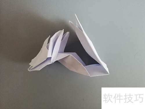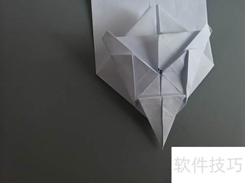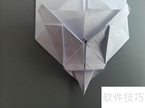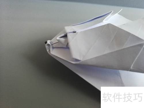 10、 将底部三角的尖角向上折叠,覆盖上层三角,再轻轻撑开折叠部分两侧的缝隙,使其鼓起形成龙鼻,最后展示的是侧面成型效果。
