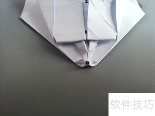 11、 将图中斜线标注的角依次折叠,同时将后部带短线的折痕向前方数字2位置推进,利用先前折好的痕迹,使推进的折痕自然嵌入2处的纸层缝隙中,最终呈现最后一幅图所示的完成形态。