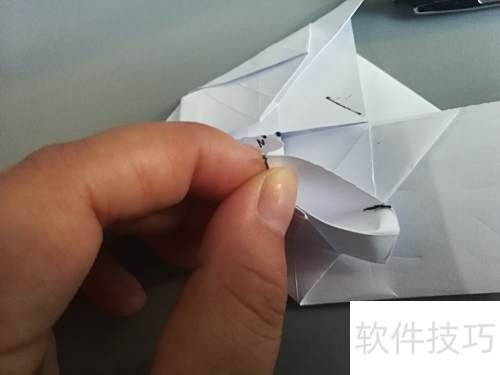 5、 将纸张翻面,把两边边缘向中间折,再将三角部分的纸层拉开,调整折痕并收拢,最终折成图示形状。