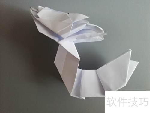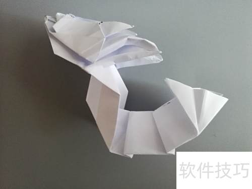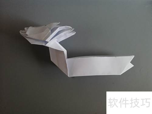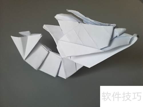 15、 处理龙身时,将龙尾向龙头方向折叠,留出适当间距后再反向折回,以此形成波浪状的龙身轮廓。龙身长度决定折叠次数,因所用A4纸比例限制,仅能折叠两次,但仍能清晰呈现出龙的基本形态。