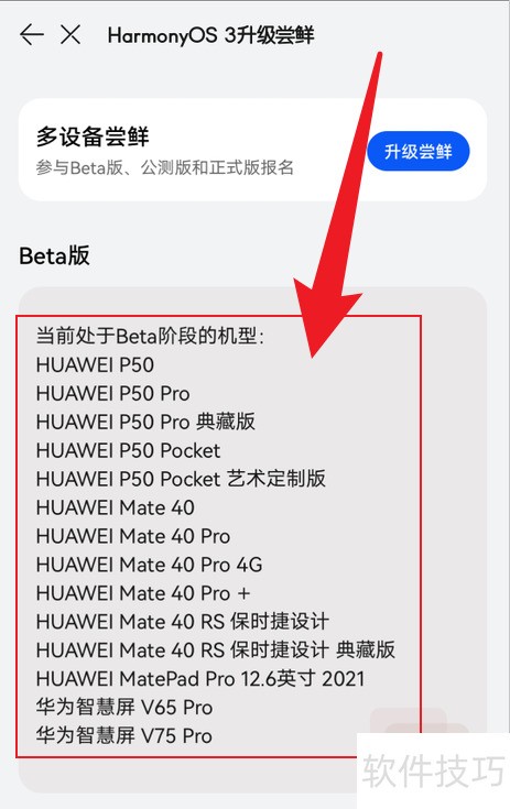4、 进入页面后,查找鸿蒙3.0升级名单即可查看