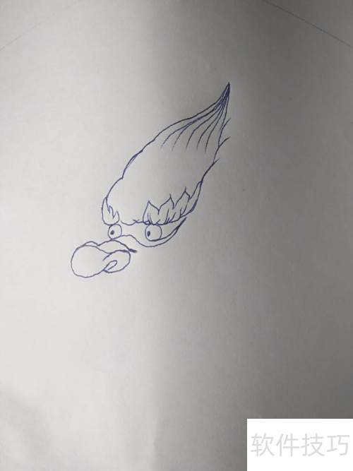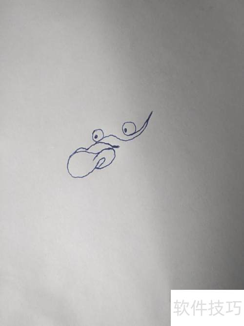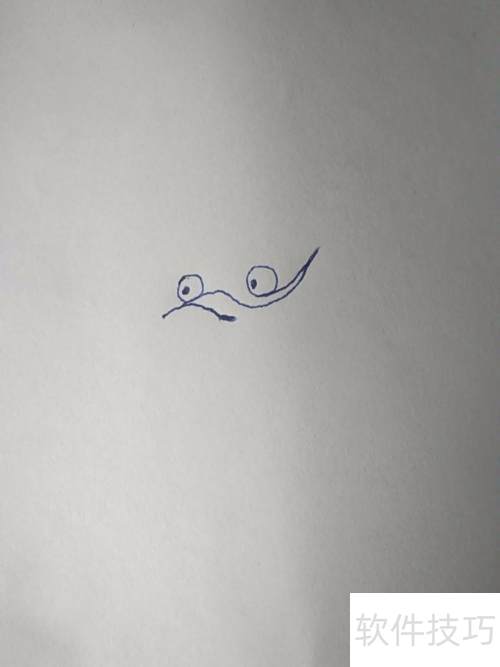 3、 在圆形中央画两只眼睛,注意透视关系,近处的稍大,远处的略小。