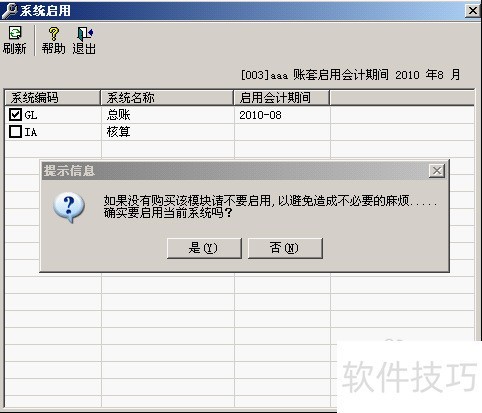 11、 启用系统后勾选GL,选择日期并确认弹出对话框中的提示。