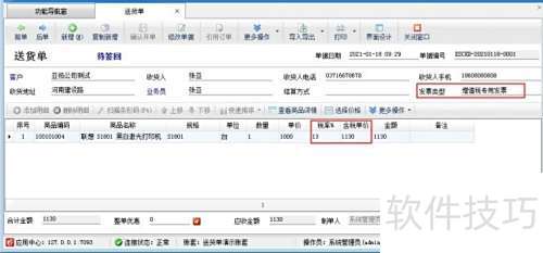 2、 完成参数配置后,进入业务处理模块,点击新开送货单,选择所需发票类型(若未显示,可在界面设计中调整设置使其可见)。系统将根据输入的商品单价及设定的发票场联税率,自动计算出对应的含税单价,具体操作界面所示。