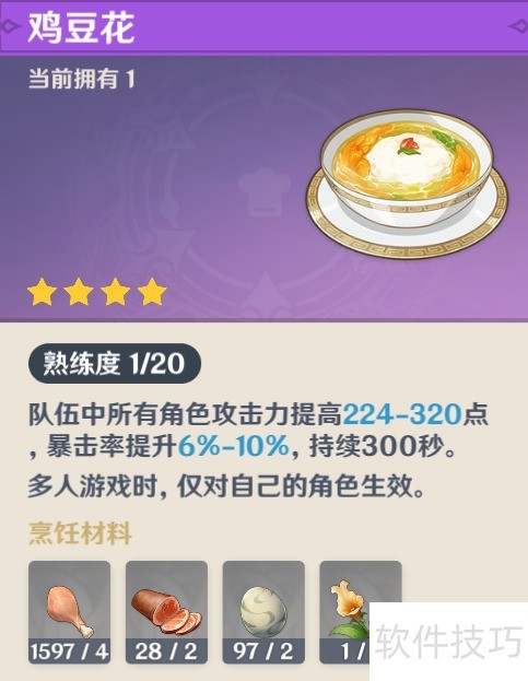 2、 鸡豆花食谱可在望舒客栈与言笑互动并完成任务获得,所需材料为禽肉四份、火腿两份、鸟蛋两枚及金鱼草一株。