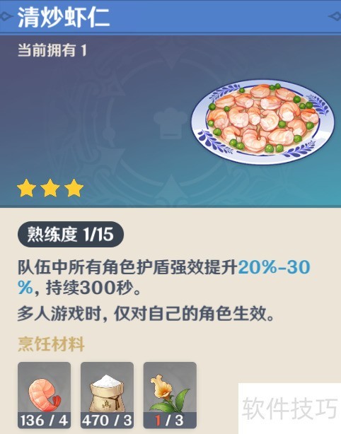 1、 清炒虾仁食谱可从望舒客栈老板娘处购得,售价5000摩拉,所需材料为虾仁、面粉、金鱼草各三个。