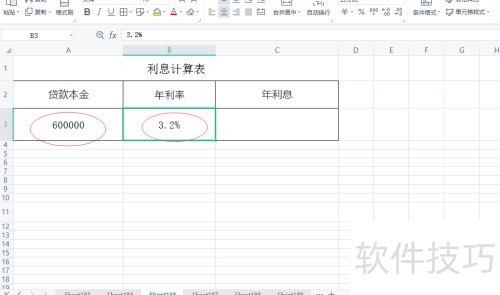 3、 在年利息单元格中输入公式=A3*B3即可完成计算。