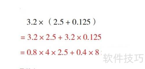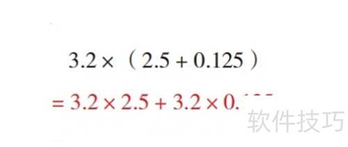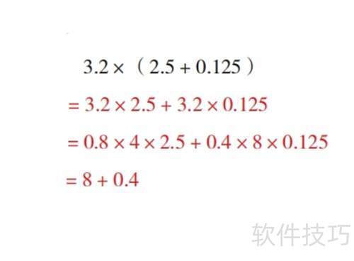 2、 利用乘法分配律,将3.2分别乘以括号内的2.5和0.125,再将两部分积相加,完成运算过程。