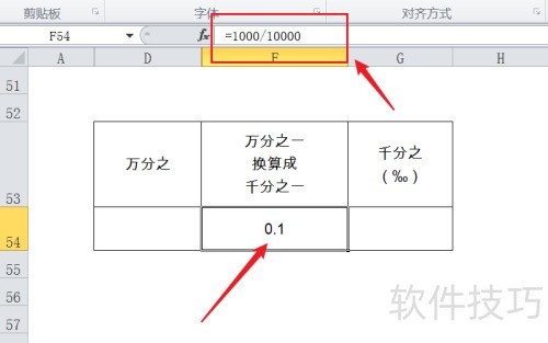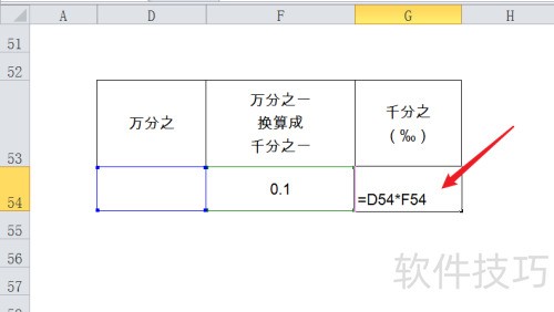 3、 在千分之单元格内输入公式=D54*F54即可完成计算。