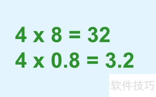 3、 依据乘法口诀,4乘8得32,两边同除以10,可得4乘0.8等于3.2。