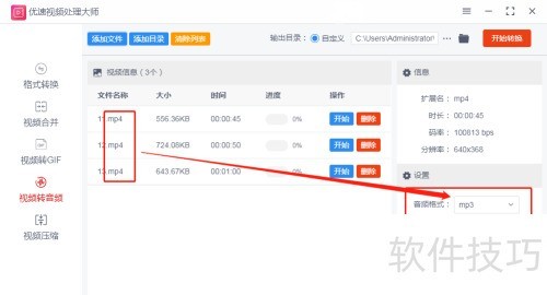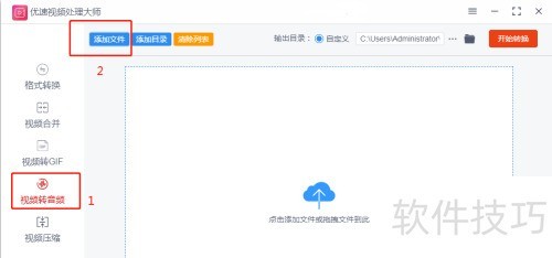 1、 首先启动电脑,运行优速视频处理大师2.0.2.1,从左侧功能栏选择视频转音频。点击顶部蓝色添加文件按钮,导入需转为MP3格式的视频文件,支持多次添加,便于批量处理多个视频。