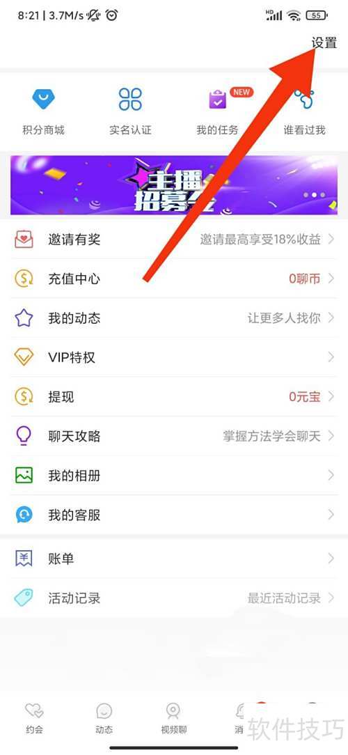 2、 进入个人页面,点击设置选项。