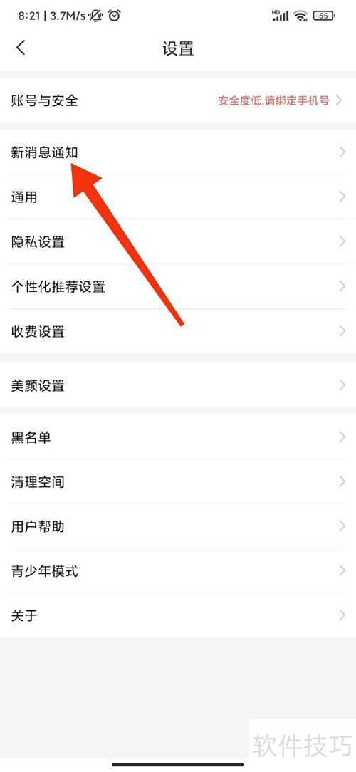 3、 进入设置页,点击新消息通知选项