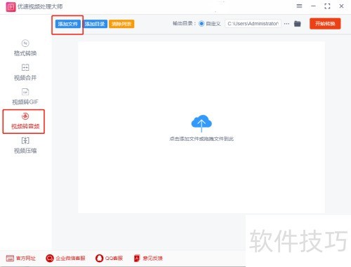 2、 开机后启动优速视频处理大师2.0.2.1,选择左侧第四项视频转音频功能,点击顶部蓝色添加文件按钮,导入需转换为MP3格式的视频文件即可开始操作。