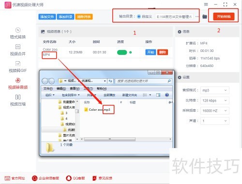 6、 在右上角设置输出目录以指定MP3保存路径,点击开始转换,完成后文件夹将自动弹出。