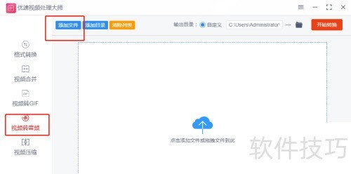 1、 首先启动电脑,运行优速音频处理大师2.0.2.1,选择视频转音频功能,点击添加文件导入需转换为MP3的视频,支持多次添加,实现批量处理,操作简便高效,轻松完成多个视频音频提取与格式转换任务。