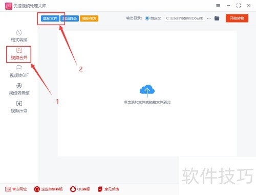 1、 首先启动电脑,运行优速音频处理器2.0.2.1软件。在左侧功能区选择视频合并选项,点击添加文件按钮,将需合并的两个视频文件导入软件,为后续操作做好准备。
