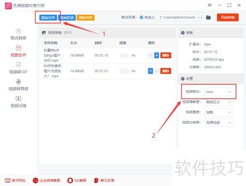 2、 第二步,所示,通过点击蓝色上下箭头调整视频排列顺序,软件将按从上到下的顺序进行合并。随后选择输出格式,建议选用mp4格式,因其兼容性强,应用广泛,适合大多数设备播放和分享。