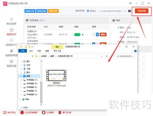 3、 第三步,完成设置后点击开始转换按钮启动程序,合并结束后软件将自动打开输出文件夹,其中已保存好合并完成的视频文件。