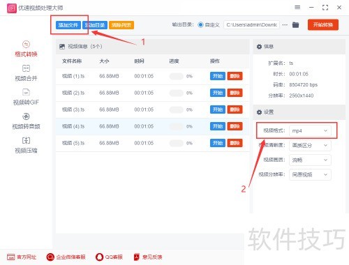 2、 第二步,点击按钮导入ts视频,或直接拖拽文件至软件窗口,支持多文件批量转换;随后在输出格式处选择mp4,即可完成视频格式转换。