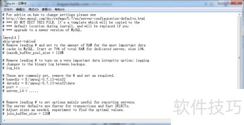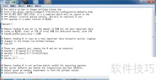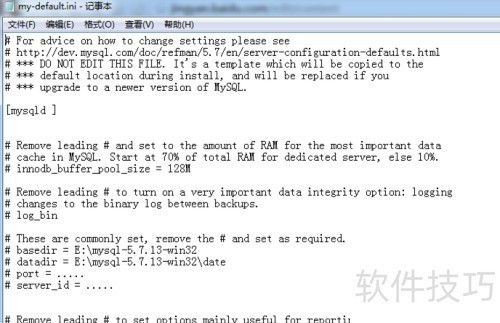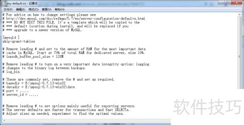 6、 配置完环境变量后,不要立即启动MySQL,需先修改配置文件,否则启动时可能出现错误2 系统无法找到文件的提示。MySQL 5.7默认的配置文件位于C:Program FilesMySQLMySQL Server 5.7my-default.ini,但该文件通常不直接使用。建议手动创建一个新的my.ini文件,并将其放置在MySQL安装目录下,确保文件内容包含必要的基础配置,如数据存储路径、端口设置等,以便服务能正常读取并启动。