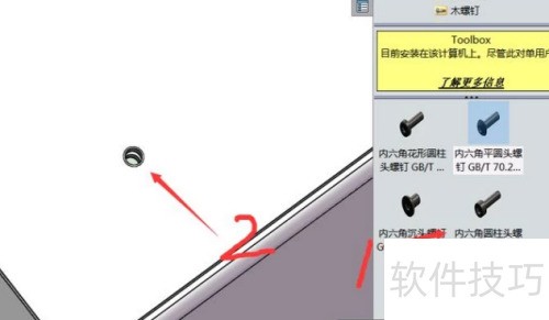6、 选择所需螺钉并拖至孔位上方,系统将自动完成装配;若未准确安装,可通过添加约束进行调整与固定。
