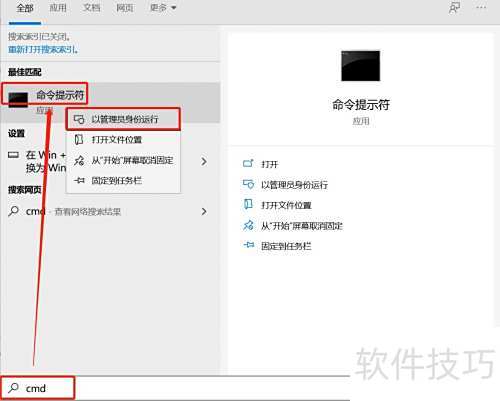 1、 在电脑中搜索命令提示符或cmd,右键选择以管理员身份运行。