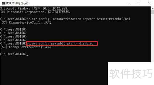 3、 在命令提示符中输入 sc.exe config mrxsmb20 start= disabled 并按回车,执行完毕后重启计算机,即可正常访问共享文件夹。