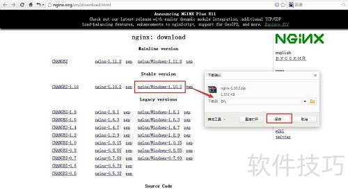 1、 通过浏览器访问百度,搜索nginx download,在搜索结果中点击第一个链接。进入官网后,找到稳定版本(Stable version)中的nginx/Windows-1.10.2,选择下载并将其保存至D盘根目录,等待下载完成即可获取nginx软件安装包,为后续安装和配置做好准备。