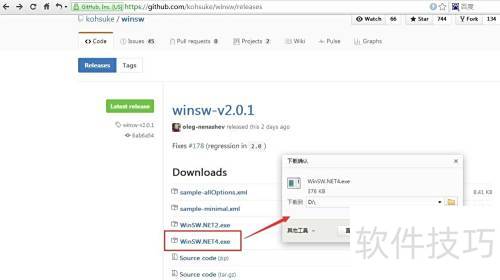 3、 请访问图示链接进入下载页面,根据系统类型选择相应文件:32位系统下载WinSW.NET2.exe,64位系统下载WinSW.NET4.exe。点击下载后,将文件保存至D盘根目录即可。
