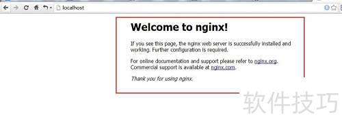 9、 在浏览器地址栏输入localhost并按回车,访问Nginx默认的80端口,页面将显示Nginx的欢迎界面,所示。