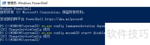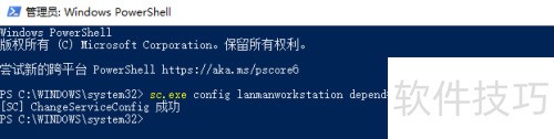 2、 在打开的Powershell中,键入命令 sc.exe config lanmanworkstation depend= bowser/mrxsmb10/nsi,随后按下回车键执行即可。