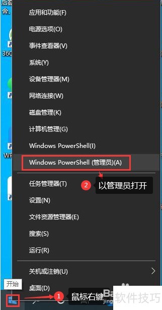1、 在电脑桌面左下角的开始菜单上右键点击,选择以管理员身份运行命令提示符(cmd.exe),即图中的Windows PowerShell(管理员)。