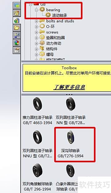 在SolidWorks装配体中通过Toolbox插入轴承标准件。