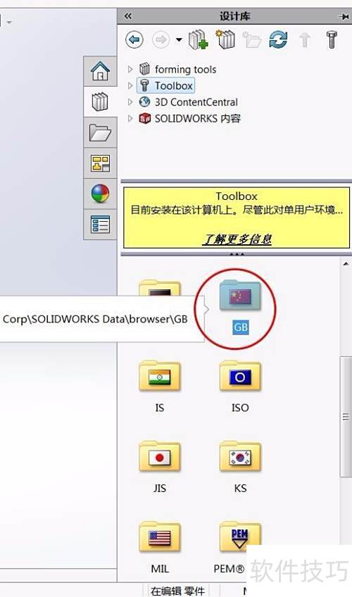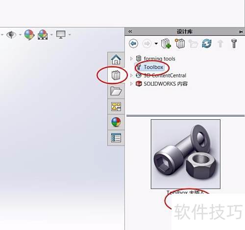 1、 打开SolidWorks右侧书本图标,点击Toolbox,从下拉菜单中选择现在插入即可。